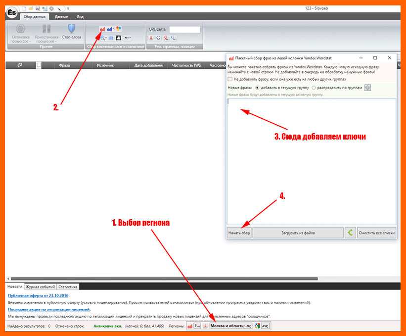 Как пользоваться парсингом Вордстата в программе Словоеб