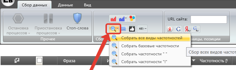 Теперь можно собрать частотности и в кавычках, и с восклицательным знаком. Для этого выберите в панели инструментов значок лупы.