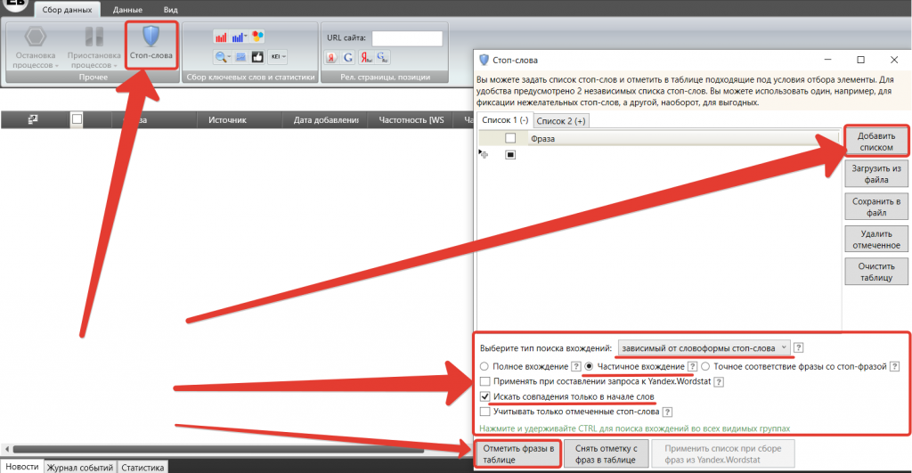 Открываем программу, заходим в меню Стоп-слова, нажимаем Добавить списком и вбиваем основные стоп-слова нашей тематики.
