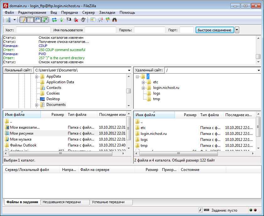 В окошках слева присутствуют локальные диски вашего компьютера. В окошках справа будут отображаться удаленные файлы, например, с сервера или хостинга. Конечно, сначала нужно зарегистрироваться на хостинге и получить данные для FTP-подключения. Обычно это адрес сервера, имя пользователя и пароль.