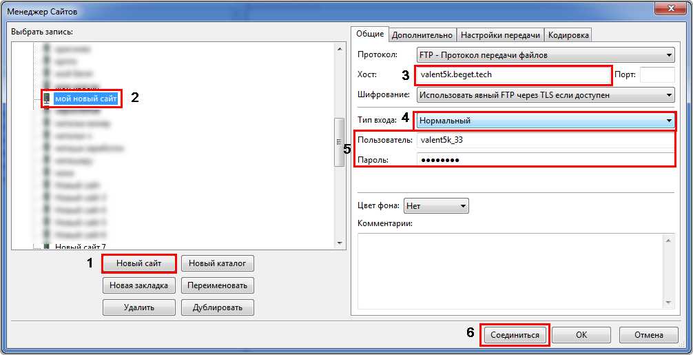 Вначале вам нужно будет добавить сайт, дать имя, ввести ваши данные и нажать кнопочку Соединиться. После чего, произойдет подключение к вашему серверу.
