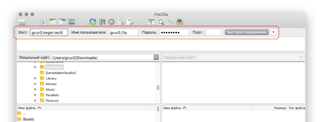 Чтобы подключиться быстро можно использовать поля раздела вверху программы. Там есть «Хост» — имя или адрес сервера, «Имя пользователя» — полученное от вашего хостера, «Пароль» — также полученный от хостера или измененный вами и «Порт» — обычно это 21.
