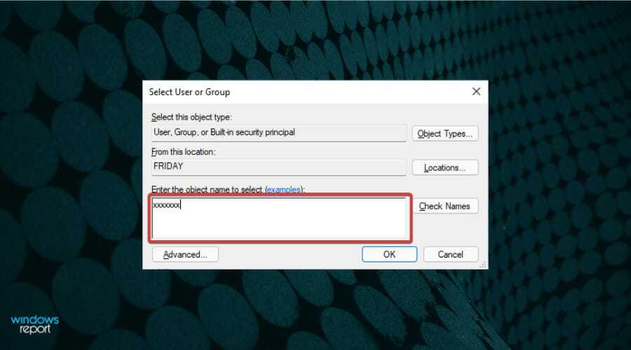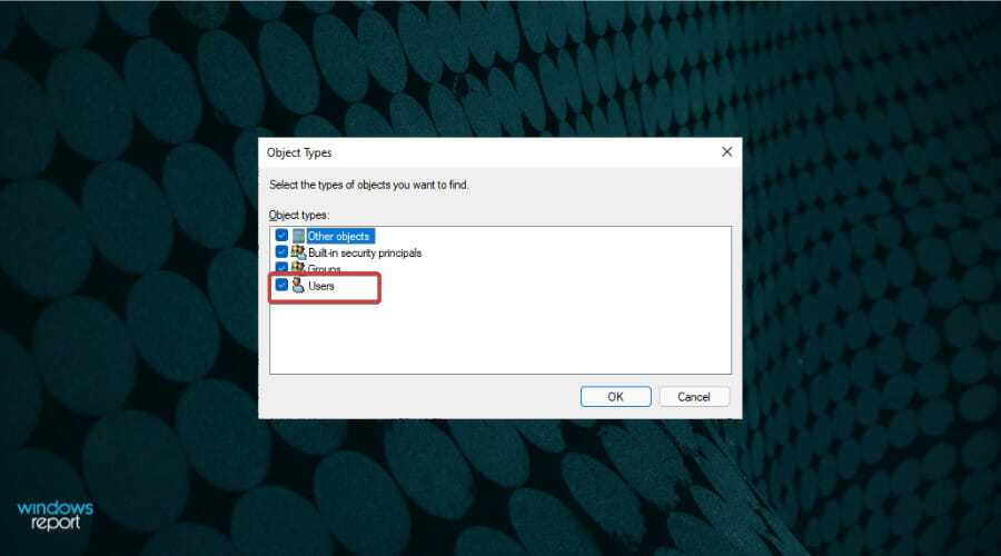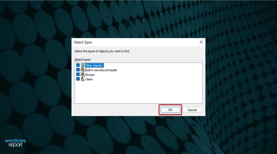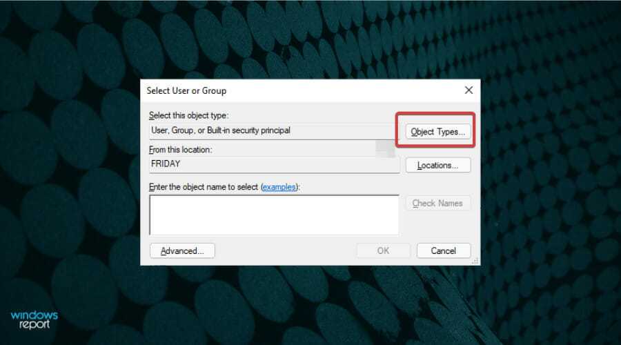 В окне « Выбор пользователя или группы » нажмите « Типы объектов » .