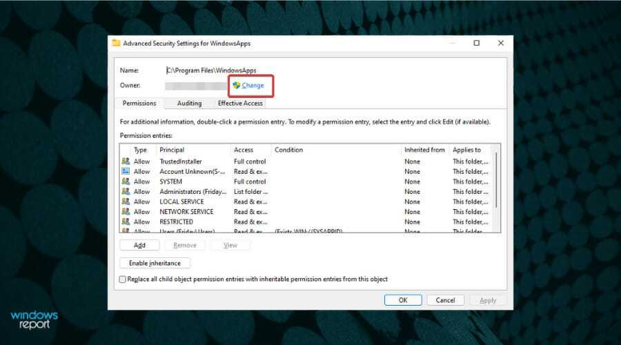 В появившемся окне нажмите « Изменить» , чтобы изменить владельца папки.