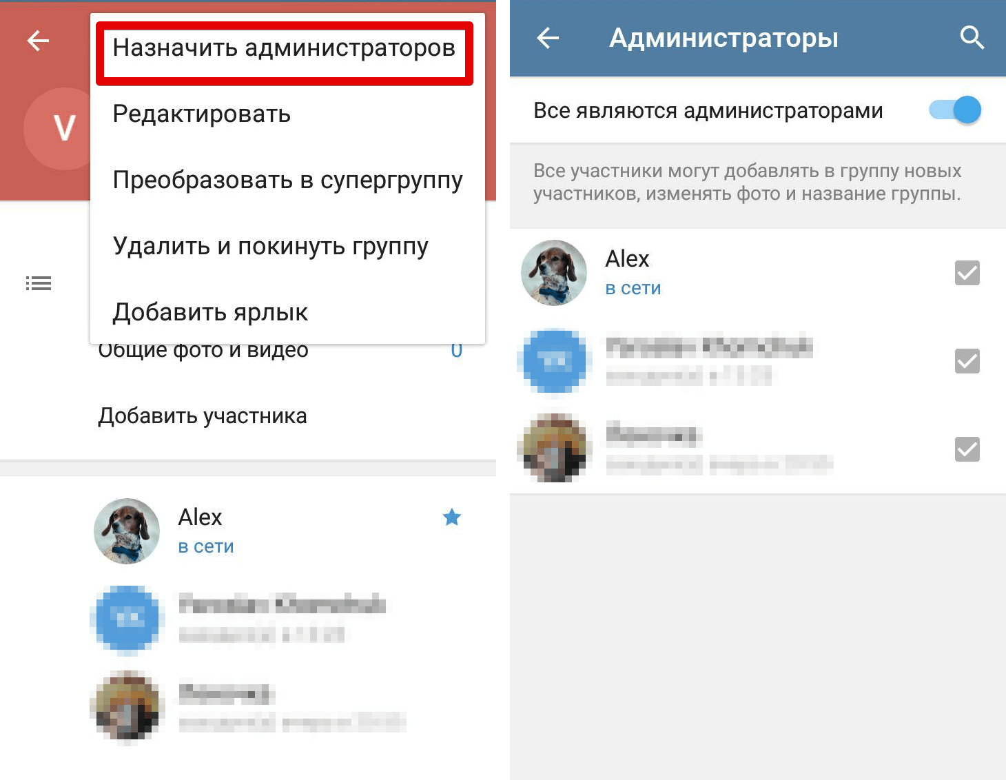 По умолчанию все пользователи могут менять настройки группы и приглашать пользователей. Однако, если вы хотите навести порядок в вашей группе, вы можете отключить эту функцию и вручную и назначить администраторов. Для этого зайдите в меню (нажать на три точки в правом верхнем углу). Выберите «Назначить Администраторов» и выключите кнопку «Все являются администраторами». Затем вы вручную можете выбрать тех людей, которых хотите видеть администраторами.