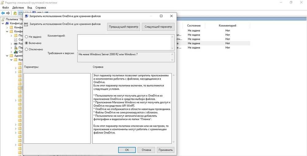 - Измените значение параметра Запретить использование OneDrive для хранения файлов на Включено.