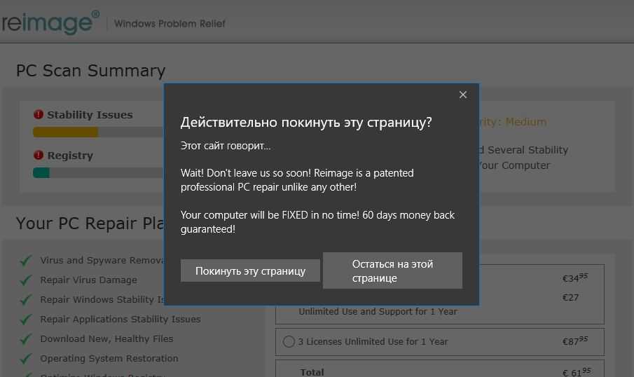 После нажатия кнопки “Запустить ремонт”, вы можете найти себя на неизвестных сайтах, призывающих вас купить продолжительность жизни для Reimage Plus. Это ваш выбор. Если вы уже скачали эту программу, вы должны либо удалить Reimage PC Repair либо, сохранить его в качестве второго программного обеспечения в опции безопасности.