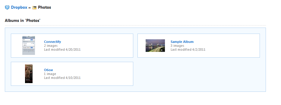 Фотогалереи. Чтобы поделиться своими фотографиями с друзьями и знакомыми необязательно регистрироваться на специальном фотохостинге. В Dropbox фотографии нужно хранить в особой папке «DropboxPhotos». Каталогизируются фото по директориям, на которые в контекстном меню Проводника можно сгенерировать публичную ссылку. Получатель такой сможет смотреть все фотографии прямо в окне браузера, в виде фотогалереи с функцией слайдшоу и сохранением себе на жесткий диск. Существует предварительная подгрузка, поэтому снимки отображаются мгновенно, без задержек. К тому же Dropbox дает возможность делать прямые ссылки на изображения.