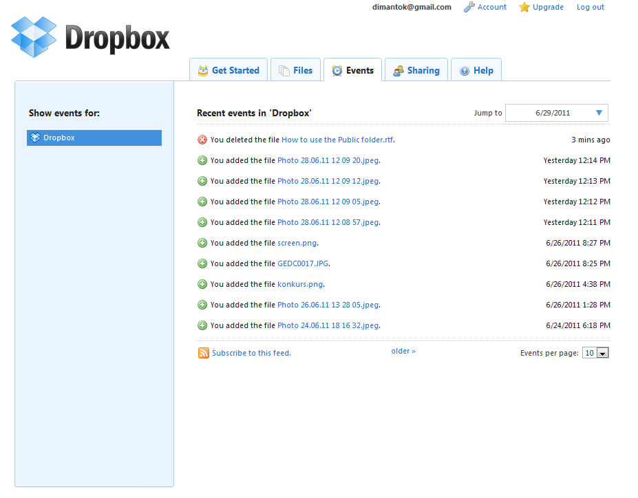 Напоследок о веб-интерфейсе. Во вкладке «Events«, находится история ваших действий с файлами/папками