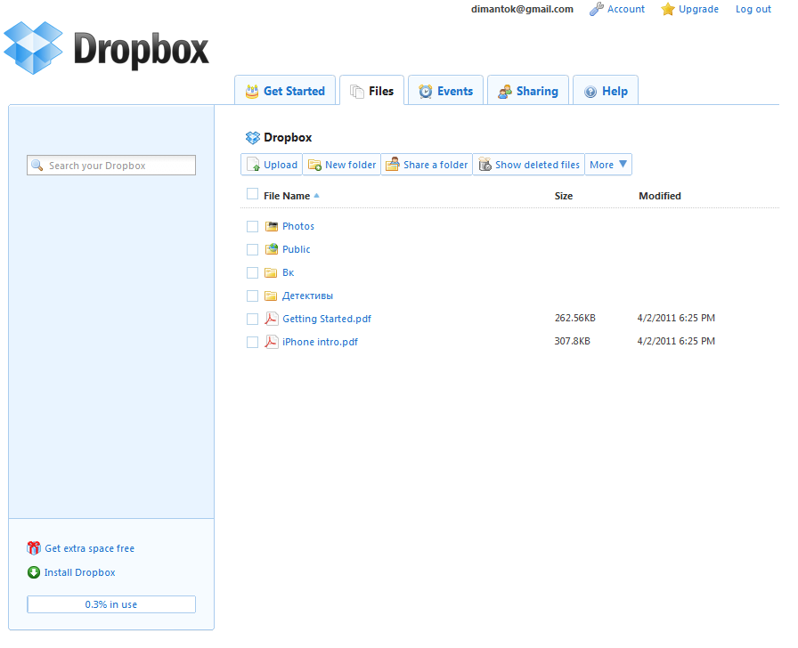 Так же можно увеличить место, если зарегистрироваться по реферальной ссылке (вам выдается 500 Мб и мне 500 Мб — https://db.tt/Zfdkmo84 ). Надеюсь, мы поможем друг другу бесплатными 500 Мб )