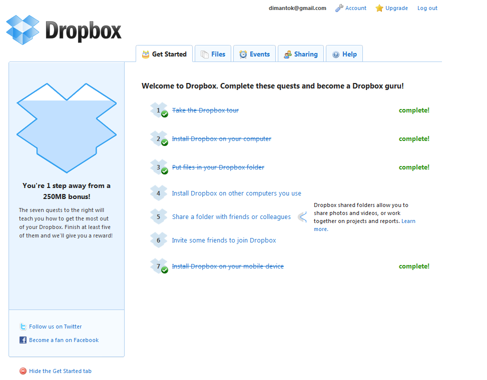 А вкладка «Get Started» проинструктирует вас, как можно получить дополнительные 250 Мб. места бесплатно