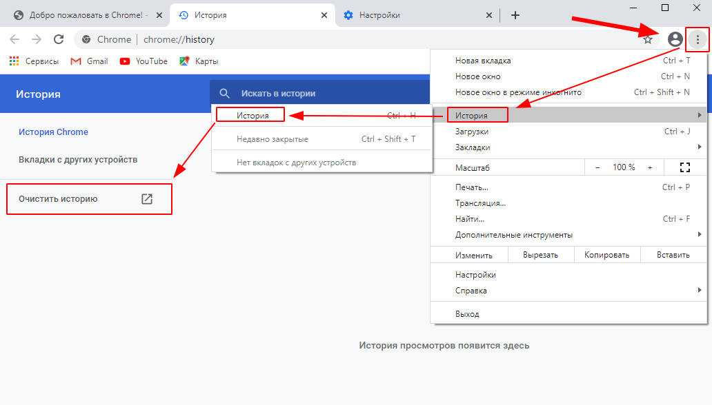 Откроем браузер. В правом верхнем углу откроем меню далее выберем пункт история, затем снова история. В открывшейся вкладке выберем Очистить историю.