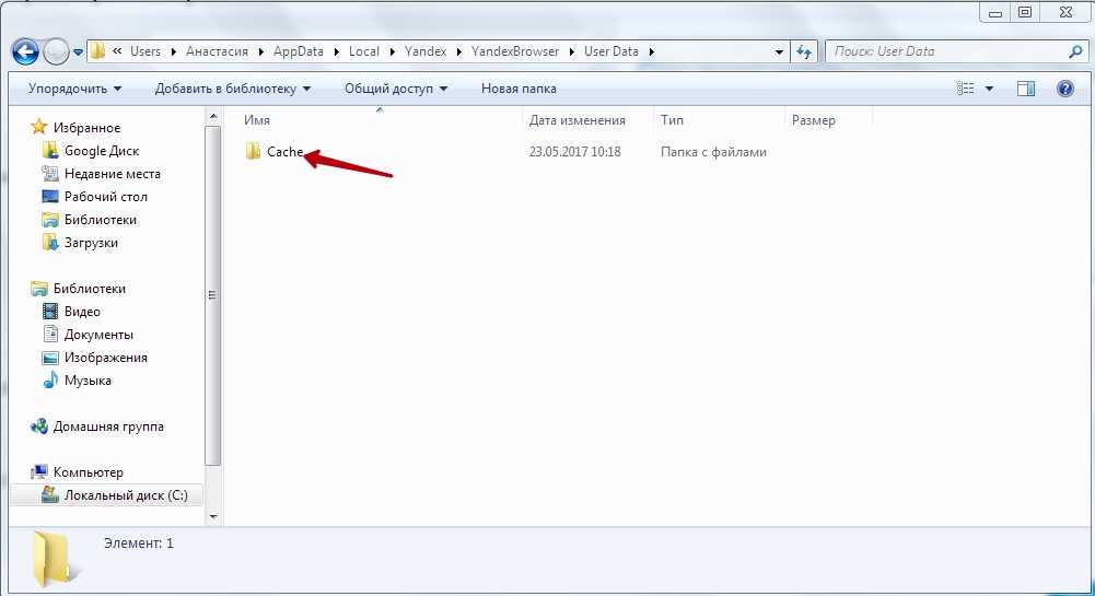 Находим кэш браузера Яндекс: