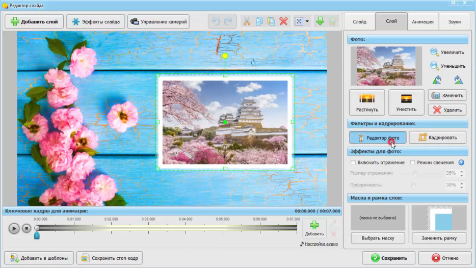 ФотоШОУ PRO – профессиональная программа для создания клипов из фото и видео. Она предлагает огромное количество шаблонов, так что вы сможете создать видео-открытку, презентацию и полноценный фильм из любимых фотографий. Встроенный редактор позволяет обрабатывать снимки на профессиональном уровне, применять фильтры, работать со слоями, настраивать контрастность и яркость и многое другое. В проект можно загружать неограниченное количество аудиодорожек и записывать голосовые комментарии.