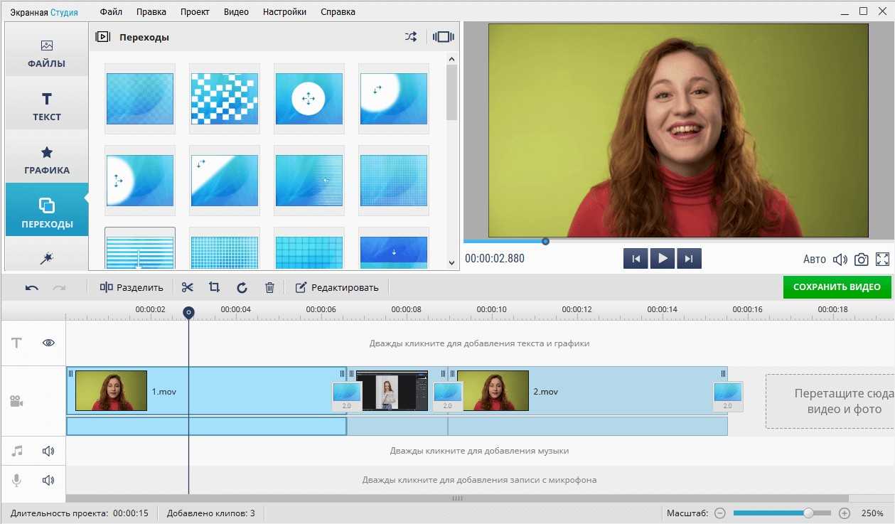 значительно сгладится. Программа содержит более 30 различных переходов — вы можете выбрать сразу