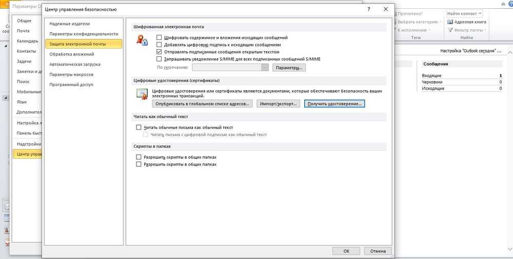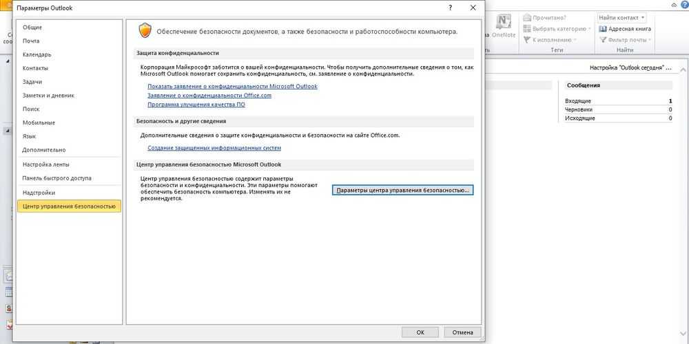 В параметрах почтового клиента перейти на вкладку «Центр управления безопасностью» и вызвать параметры центра.