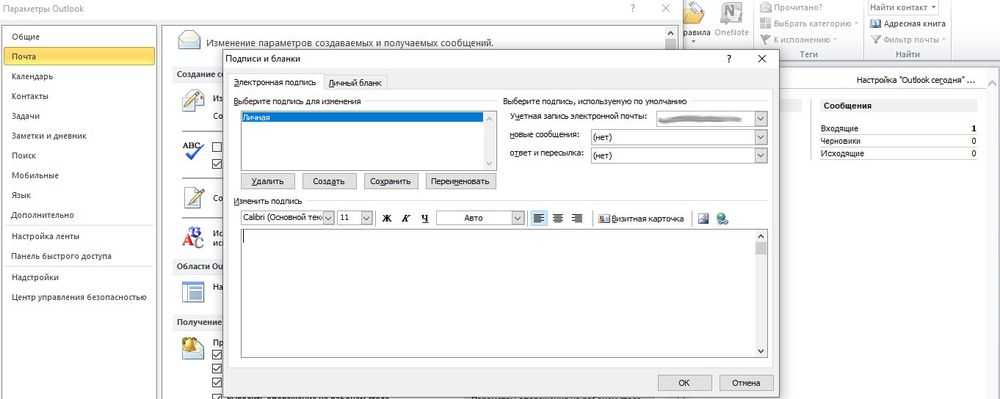 Специальная вкладка в настройках Outlook поможет создать и отредактировать подпись для исходящих сообщений по вашему вкусу и требованиям