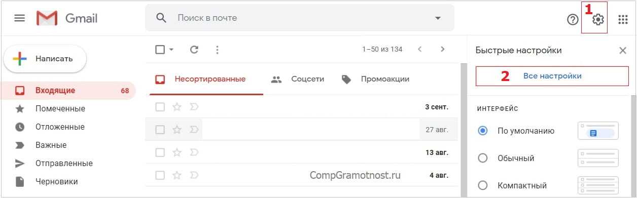Чтобы попасть в настройки почты, надо кликнуть по значку в виде шестеренки (цифра 1 на рис. 4). Появятся «Быстрые настройки». Нас интересуют «Все настройки» (2 на рис. 4), поэтому щелкаем по этой опции, появится окно «Настройки» (рис. 5).