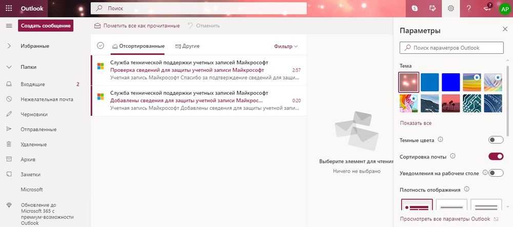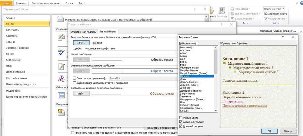 Во вкладке «Личный бланк» можно установить тему для нового сообщения (в веб-версии опция недоступна).