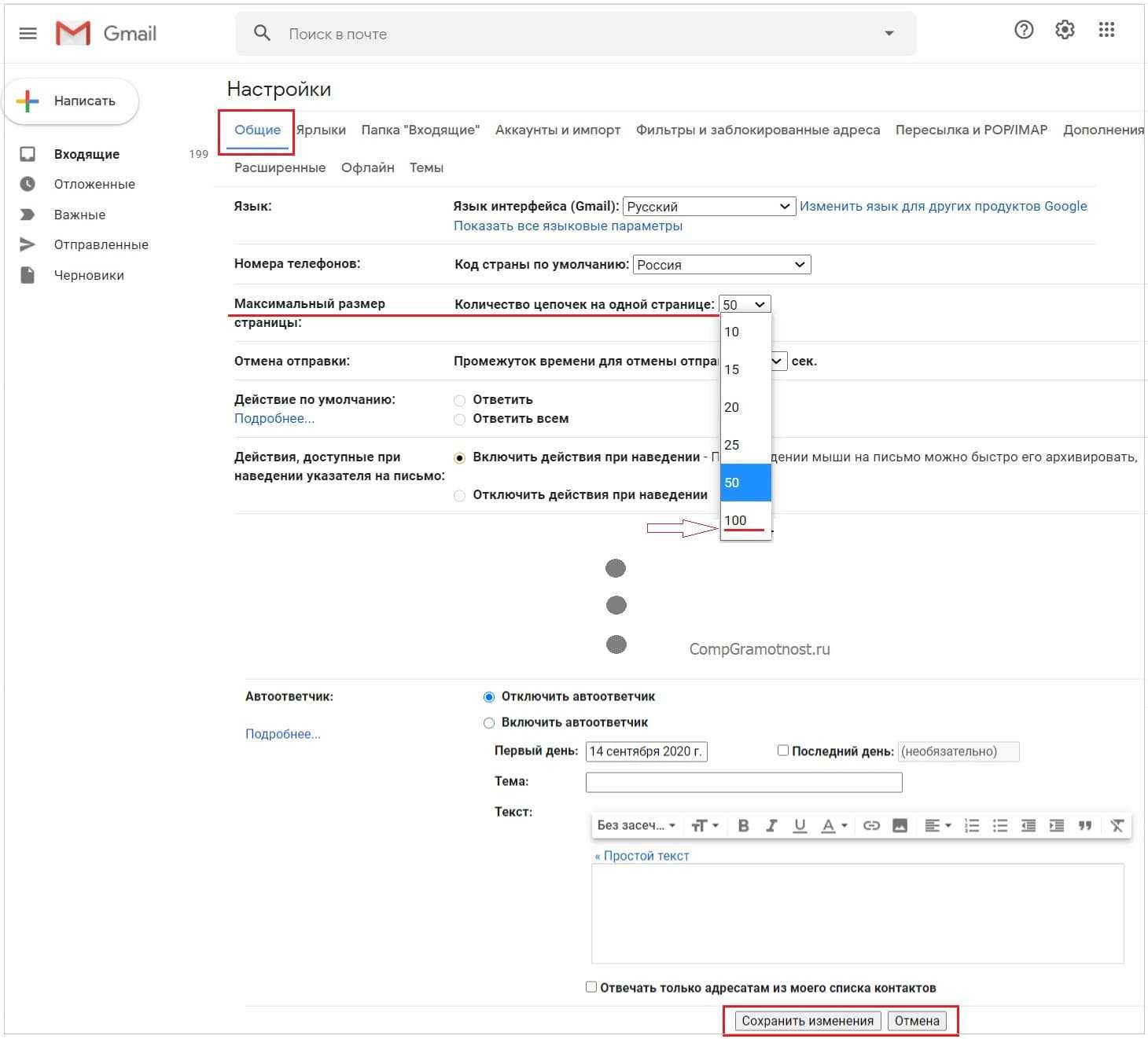 Непременно надо нажать «Сохранить изменения», тогда внесенные изменения будут сохранены. Если в опции «Количество цепочек на странице» выбрать, например, число «100» и нажать «Сохранить изменения», то с этого момента на каждой странице будет выводиться по 100 писем.