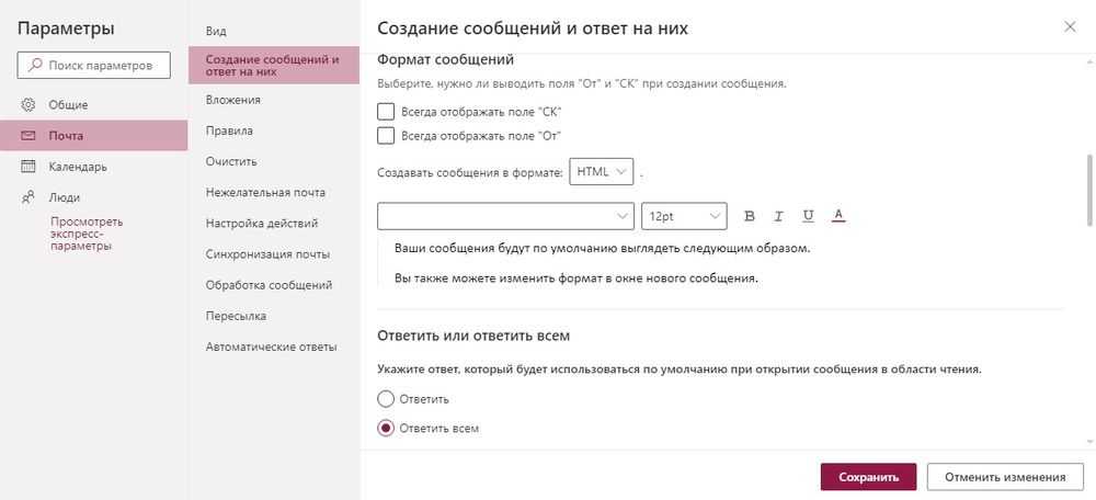 В разделе «Почта» выбрать пункт «Создание сообщений и ответ на них».