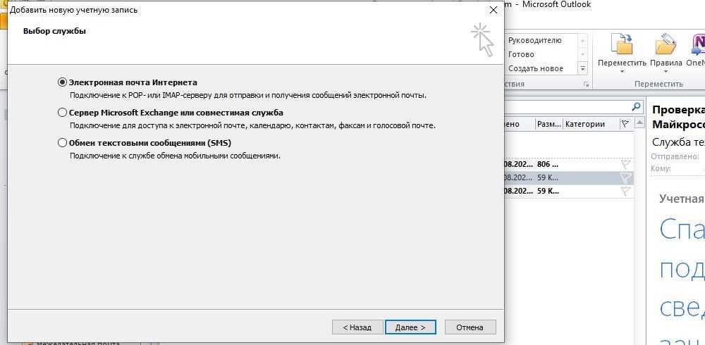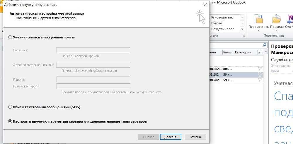 Если после нажатия на кнопку «Ок» повторно будет всплывать окно новой электронной почты, значит, возникла ошибка при автоматическом подключении, нужно нажать «Отмена» и сделать это вручную. В окне добавления учетной записи следует выбрать последнюю опцию – «Далее».