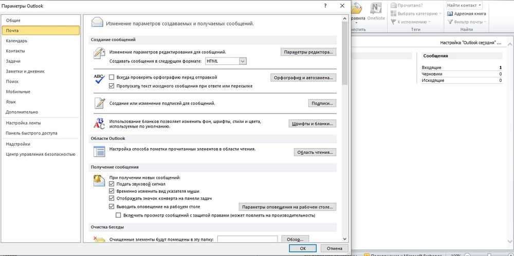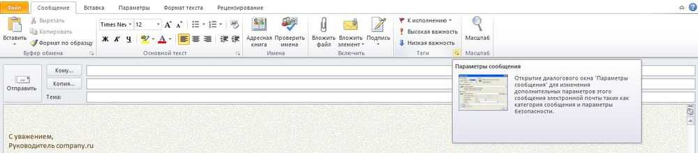 Во вкладке «Параметры» Outlook 2010 находится функционал для настройки подписей писем