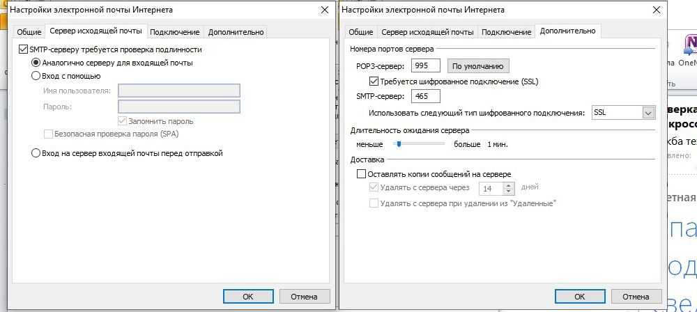 Открыть другие настройки. Во вкладке «Сервер…» поставить галочку в пункт проверки подлинности. Во вкладке «Дополнительно» выбрать шифрование SSL. Если в п.6 был выбран тип POP3 – вписать значение 995, если IMAP – 993. В обоих случаях для SMTP будет значение 465. Нажать «Ок» – «Далее».