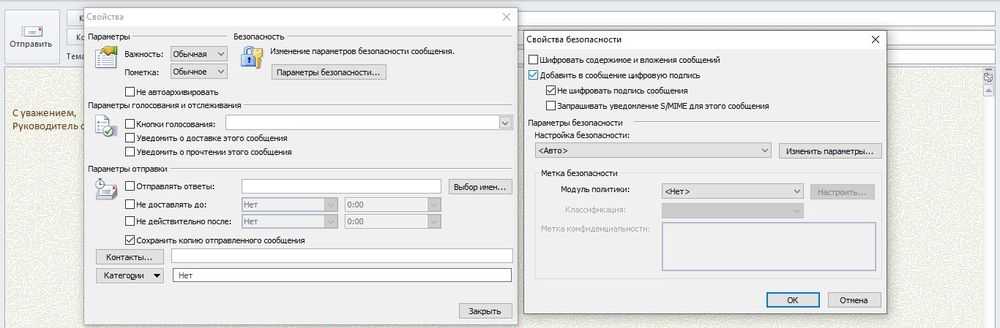 При необходимости добавляется цифровая подпись, обеспечивая еще один уровень защиты и гарантируя получателю, что именно конкретный отправитель, а не мошенник, написал письмо. Для этого: