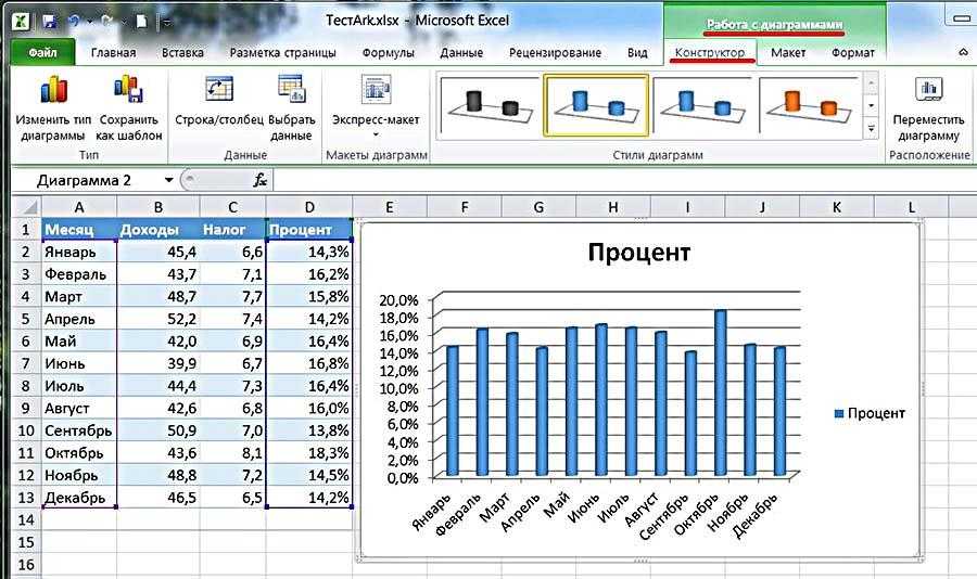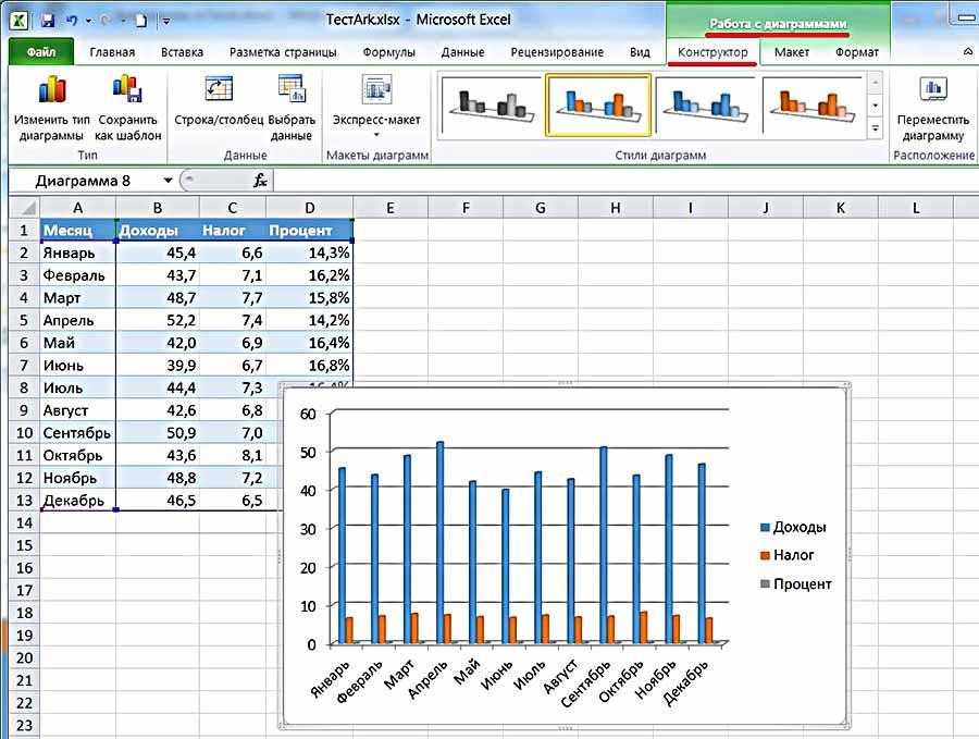 1. Прежде всего, необходимо выделить участок таблицы, на основе данных которого требуется построить диаграмму в эксель. В приводимом примере выделены все данные — доходы, налоги и проценты.