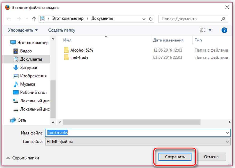 3. На завершающем этапе следует задать конечную папку для HTML-файла с закладками и дать ей название. Затем требуется кликнуть «Сохранить».