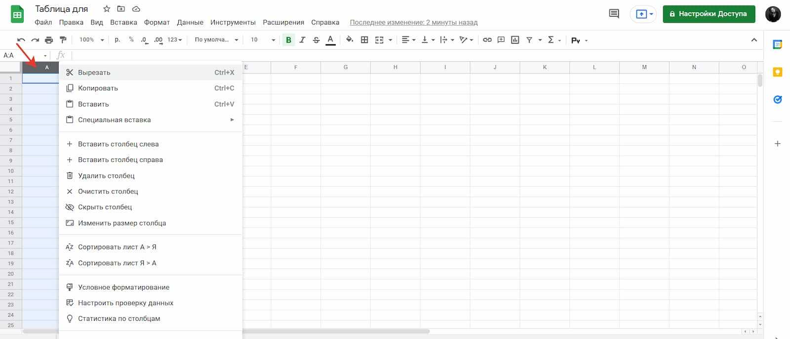 Все элементы в таблице интерактивные, а у каждой клавиши есть своя функция. Так, выбрав один из столбцов — для этого нужно нажать на верхнюю ячейку пронумерованную буквой — появится выпадающий список. Из этого списка вы сможете выбрать различные действия: вырезать или копировать, удалить или очистить столбец, настроить условное форматирование, получить статистику и др.