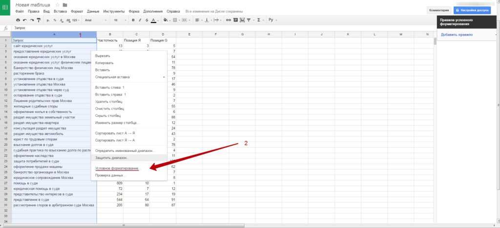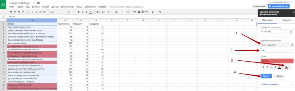В Гугл таблице, да и в эксель тоже, вы можете изменить цвет ячейки, содержащей определенное стоп-слово. Дальше отсортируем таблицу по цвету и все ячейки для удаления выстроятся перед вами в рядочек. Предположим, мне нужно удалить все запросы со словом «суд» из столбца с запросами.