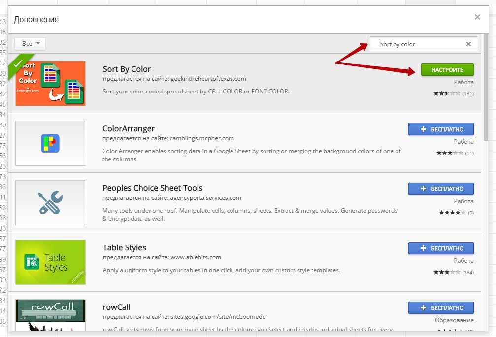 Теперь установим дополнение для нашей таблицы. Для этого в верхнем меню находим одноименную кнопку «Дополнения» ↣ «Установить дополнение». Вбиваем в поисковую строку «Sort by color» и устанавливаем расширение, как на рисунке: