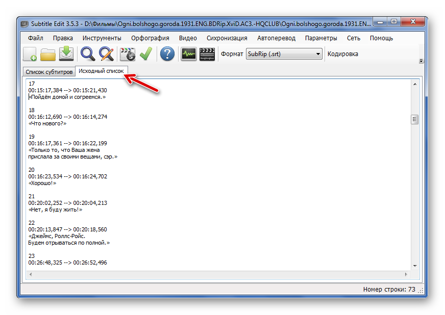 В отличие от SubRip, она представляет более широкий инструментарий для работы с титрами, включая функции редактирования и изменения. Принцип использования софта Subtitle Edit аналогичен предыдущему варианту: открыть проводник, найти нужный файл, выбрать его. В открывшемся окне отображаются титры.