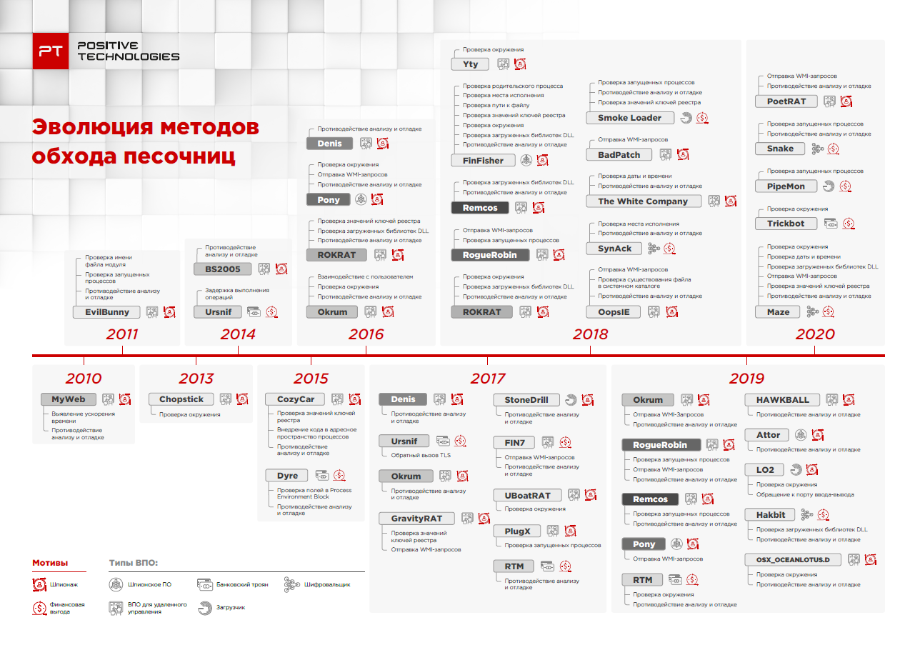 Мы проследили изменения в методах обхода песочниц и средств анализа и видим, что одно и то же ВПО в разные годы использует разные методы. Кроме того, злоумышленники стараются использовать одновременно несколько технологий. В случае если один из методов не сработает и будет перехвачен песочницей, ВПО попытается по другому какому-то признаку определить, что выполняется в среде виртуализации, чтобы вовремя прекратить свою работу.