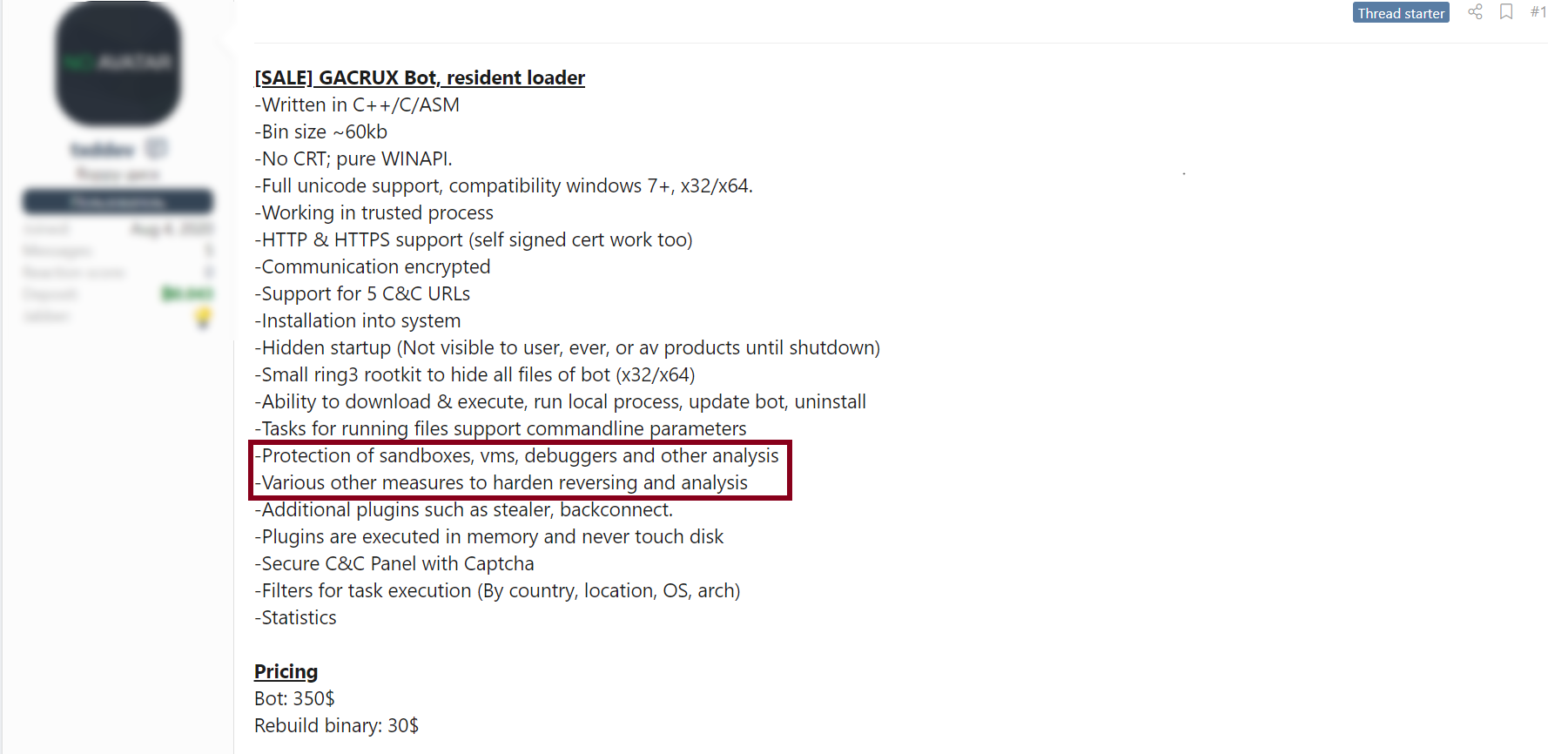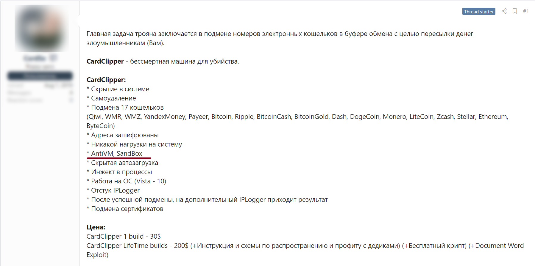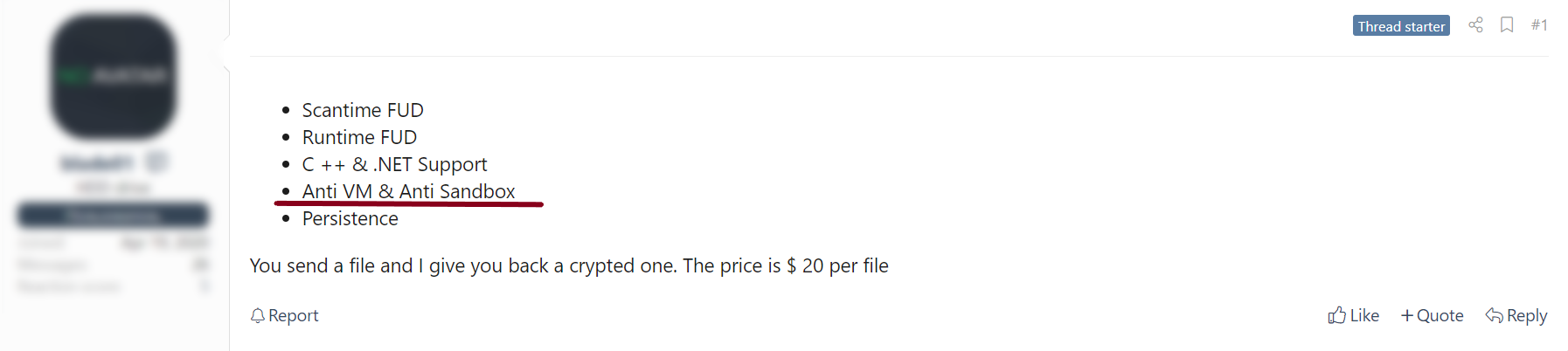 Преступники, продающие ВПО в дарквебе, также уделяют особое внимание функциям обнаружения и обхода песочниц и антивирусов, а также противодействию анализу и отладке. Цены на ВПО, применяющее методы обхода песочниц, начинаются от 30 долл