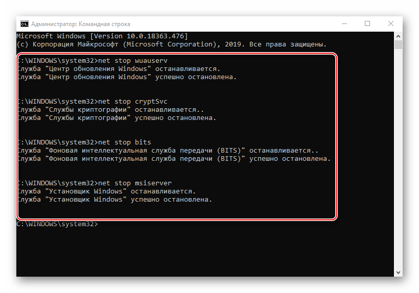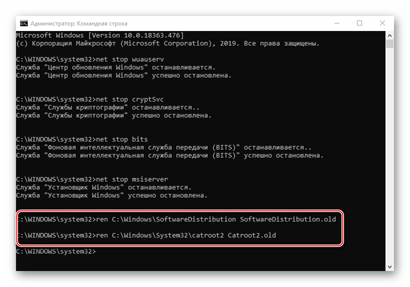 Последовательно вписываем указанные ниже команды и выполняем их нажатием «Enter». Это отключит службы, которые могут помешать выполнять дальнейшие действия. net stop msiservernet stop wuauservnet stop bitsnet stop cryptsvc