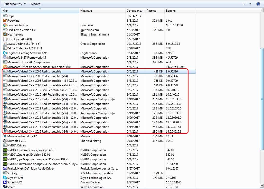 Дефект устраняется при помощи обновления и переустановки программного комплекса. Предпочтительнее полностью переустановить Visual C++. Перед этим следует удалить все установленные пакеты. Для этого зайти в «Программы и компоненты» и далее по списку: