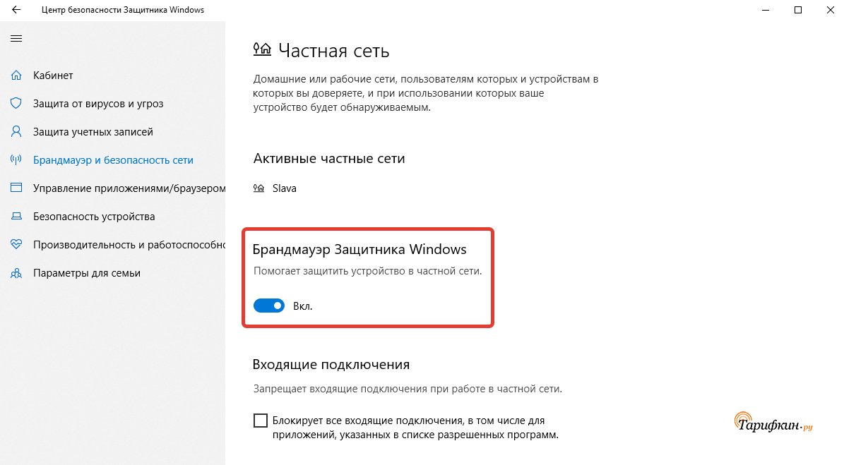 Выберите активную сеть и щёлкните на переключатель выключения брандмауэра.