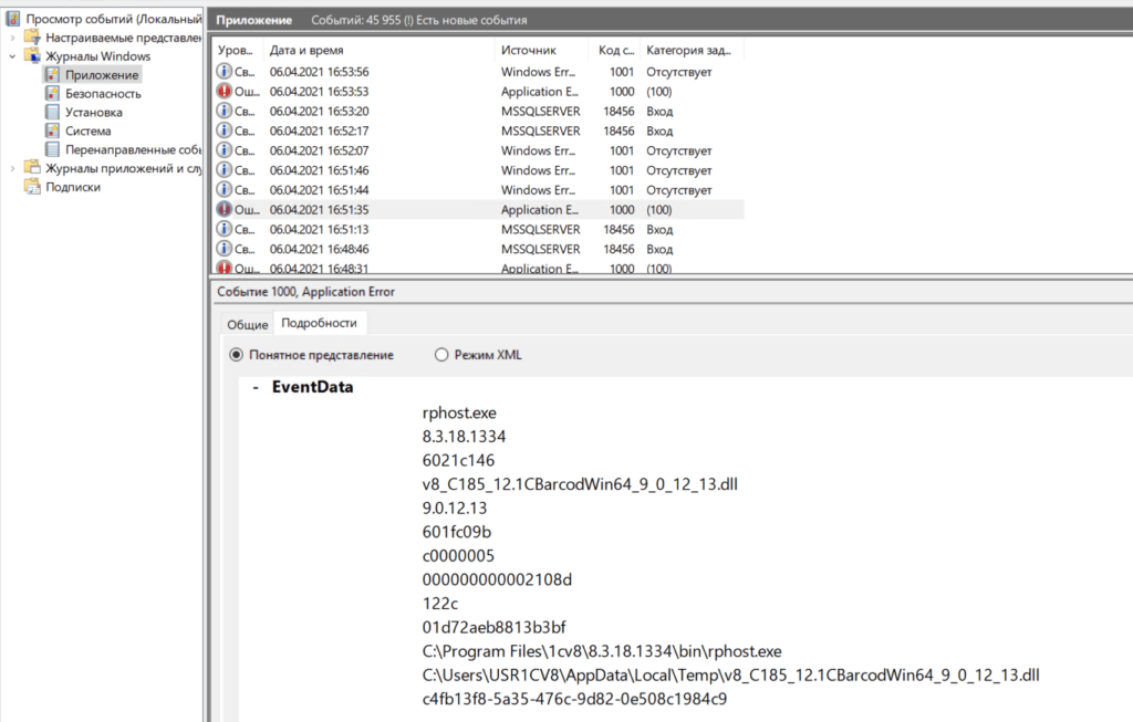 Открыв просмотр событий Windows, можно заметить, что вылет 1С:Предприятия происходил из-за файла v8_xxx_xx.1CBarcodWin64_9_0_12_13.dll, который располагался в папке C:\Users\USR1CV8\AppData\Local\Temp\.