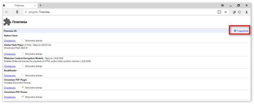 1. Ввести в адресную строку уже знакомое сочетание «Browser://Plugins».  2. Кликнуть на слово «Подробнее».
