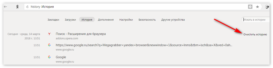 1. Открыть меню (кнопка выглядит как значок из трех горизонтальных полосок). 2. Выбрать пункт «История».  3. В появившемся окне снова выбрать пункт «История».  4. Нажать на «Очистить историю».