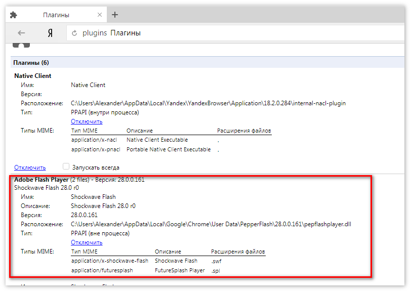 В предоставленном списке посмотрите, есть ли более, чем один плагин Flash Player. Если да, то отключите тот, который имеет тип PPAPI, после чего перезагрузите браузер.