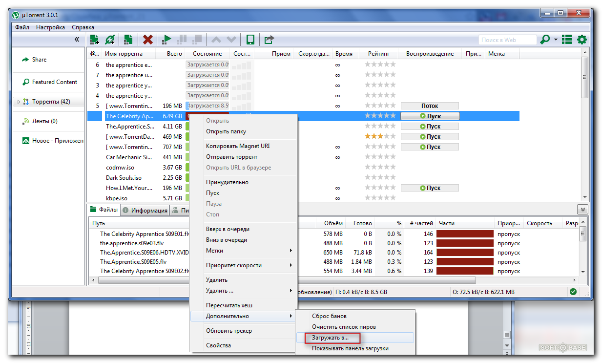 Стоит отметить, что эта ошибка может возникать не только при использовании флеш-накопителей, но и в том случае, если папка, которая использовалась для сохранения, была удалена. В этом случае метод решения проблемы полностью идентичен описанному выше. Просто укажите новую папку и все заработает. Весь этот процесс можно выполнить намного быстрее. Для этого необходимо кликнуть правой кнопкой мышки на загружаемом файле и в появившемся меню выбрать строку «Загружать в…», после чего указать желаемую папку для сохранения. Однако стоит отметить, что это будет касаться только текущей загрузки, а при последующих скачиваниях утилита будет использовать каталог, указанный в настройках. Поэтому первый вариант решения проблемы более предпочтителен, ведь намного проще сделать все необходимое один раз, чем сталкиваться с ошибкой «Не смонтирован предыдущий том» при каждой попытке скачать информацию с torrent-файла.