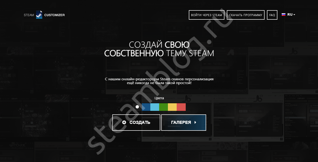 SteamCustomizer – один из самых известных сервисов подобного рода! Вы можете выбрать подходящий скин из огромнейшей галереи, куда авторы загружают свои работы, или попробовать создать оформление интерфейса самостоятельно. К вашим услугам мощный редактор с огромным количеством встроенных функций и возможностей.