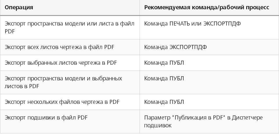 - «ЭКСПОРТПДФ» – для отображения окна «Сохранить в ПДФ»;