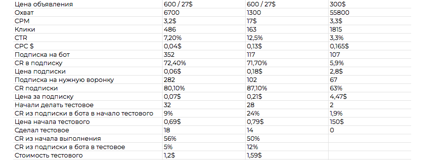 В таблице — три канала трафика: телеграм-канал, сайт с вакансиями и таргет. На таргет потратили больше всего денег, но у него высокий охват и количество кликов. Однако получили меньше всего подписок — 107. Конверсия из клика на страницу-прокладку в подписку на бот тоже низкая — 5,9%. В итоге стоимость подписки на бот с телеграм-канала — $0,06, с сайта — $0,18, с таргета — $2,8. Разница ощутима.