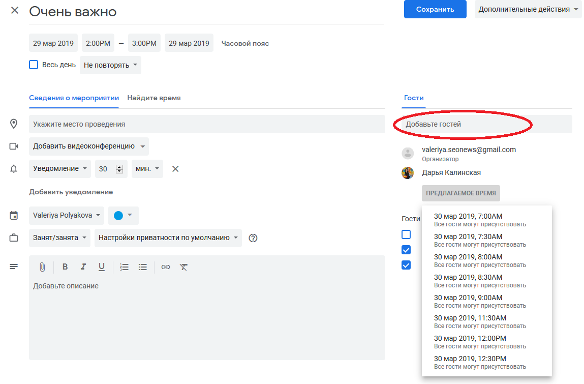 Важно: у потенциальных участников встречи должен быть аккаунт в Google и заполненное расписание в Календаре соответственно. Кроме того, Календари гостей должны быть в открытом доступе для организатора встречи