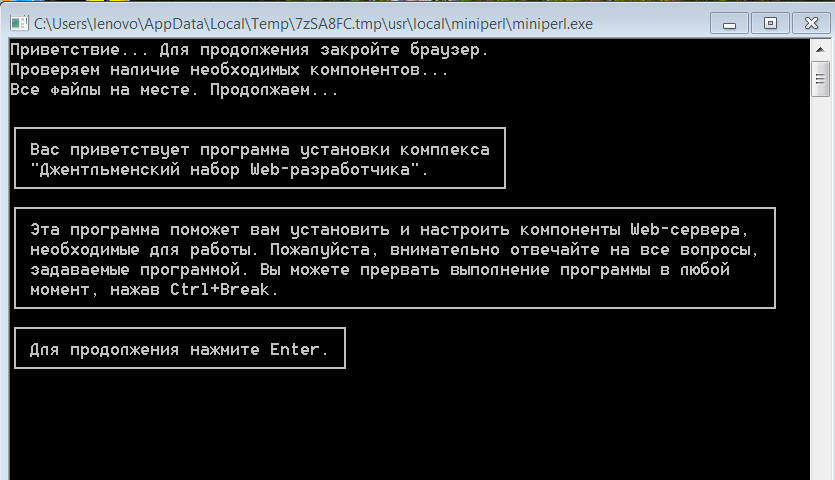 - После запуска инсталлятора появится диалоговое окно. Никаких изысков вроде красивых эффектов и графического интерфейса во время установки вы не увидите, придётся довольствоваться чёрным окошком командного интерпретатора;
